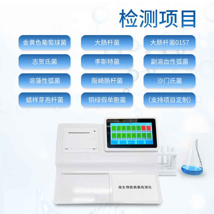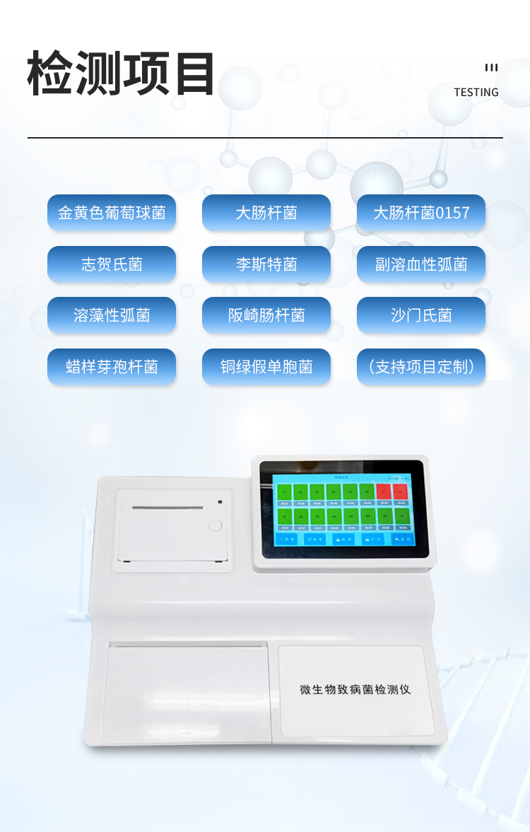金黄色葡萄球菌、大肠杆菌、志贺氏菌、李斯特菌、副溶血性弧菌、溶藻性弧菌、阪崎肠杆菌、沙门氏菌、蜡样芽孢杆菌、铜绿假单胞菌等(支持检测项目定制)