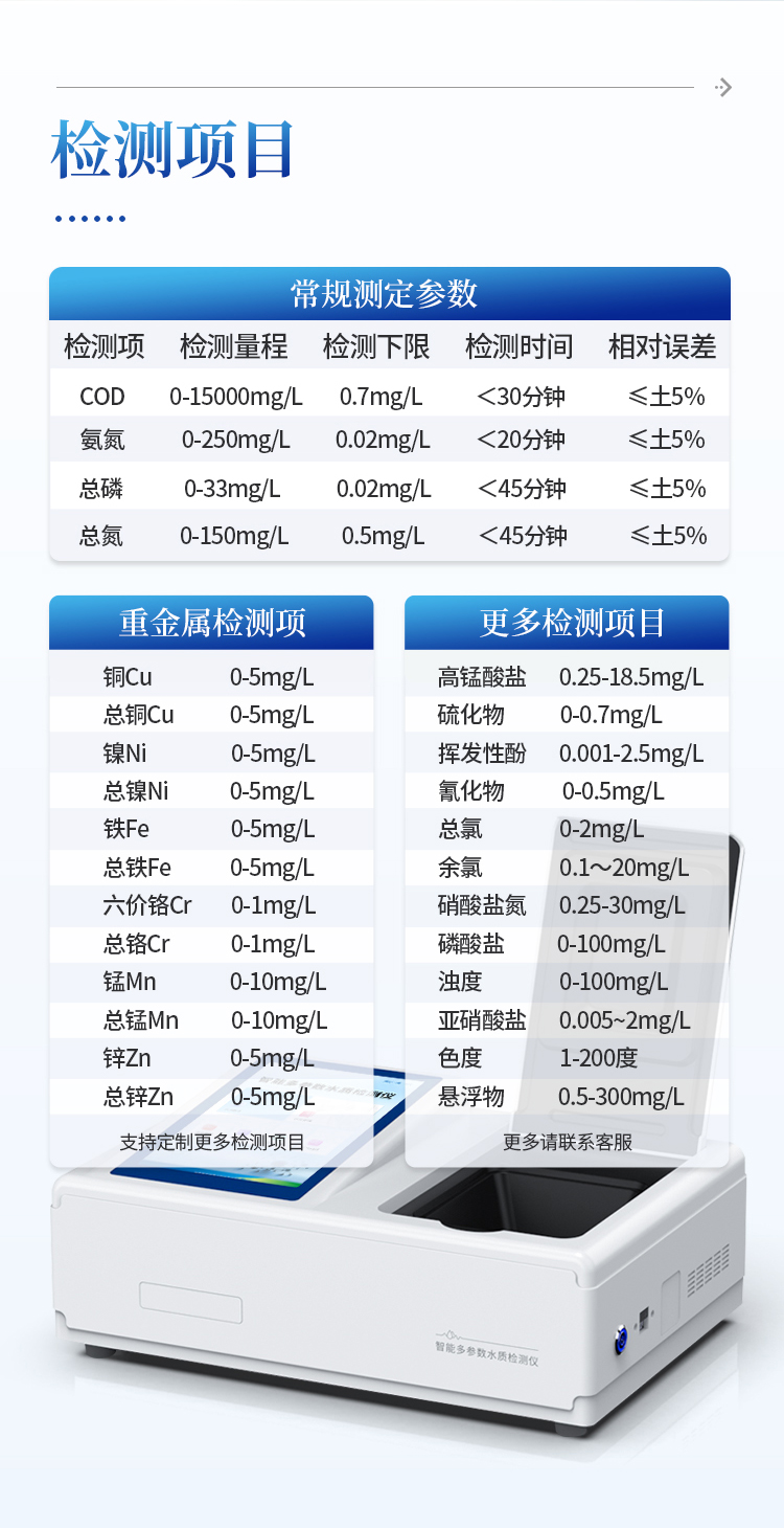 多参数水质重金属检测仪是完全参考国家标准、环境标准等相关标准设计制造,适用于国内外众多检测标准。主要检测水质六价铬、总铬、铅、镉、汞、砷、铜、总铜、锌、总锌、铁、总铁、镍、总镍、锰、总锰、钛、钒、银、铝、锡、铍、钡、锑、钴等重金属含量指标;本仪器兼具智能数据分析功能,图表、列表显示数据,分析一目了然;高清晰度彩色液晶触摸显示屏,androids智能操作系统,中文显示界面,中英文键盘,人性化操作,使用更简单。