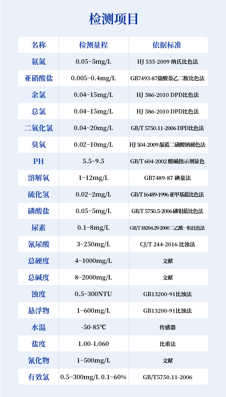 适用于纯净水厂、自来水厂、生活污水处理厂、工业污水、水产养殖、河流监测、游泳场馆、水源保护、生产监测、科研实验等。