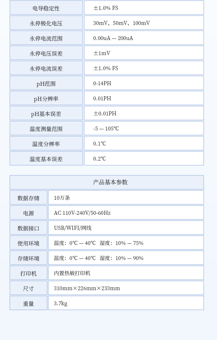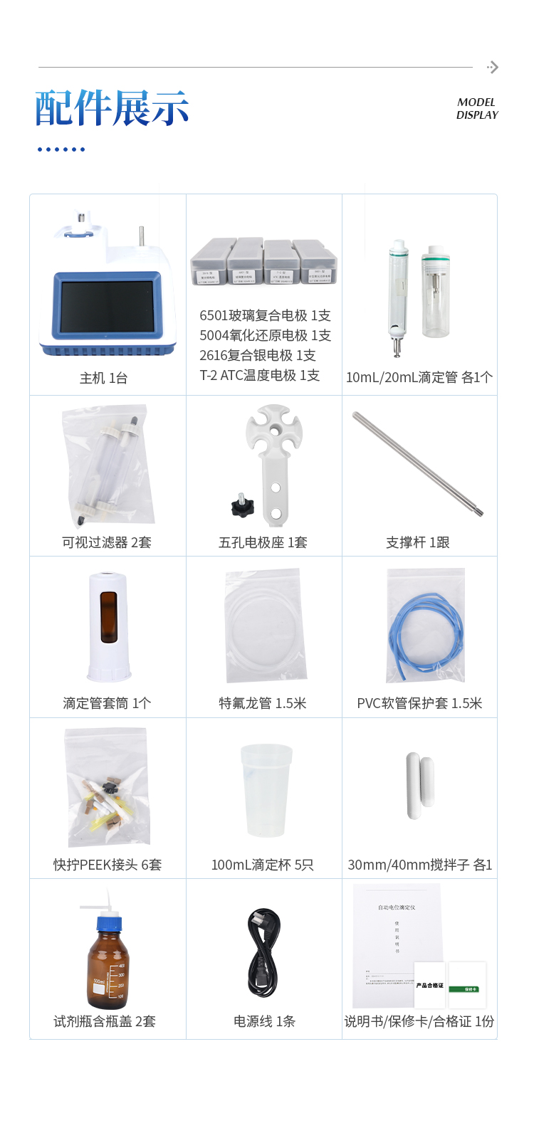 1、设备支持电位滴定和pH值测量;用户选择不同电极可进行酸碱滴定、氧化还原滴定、沉淀滴定、络合滴定等多种滴定和pH测量;