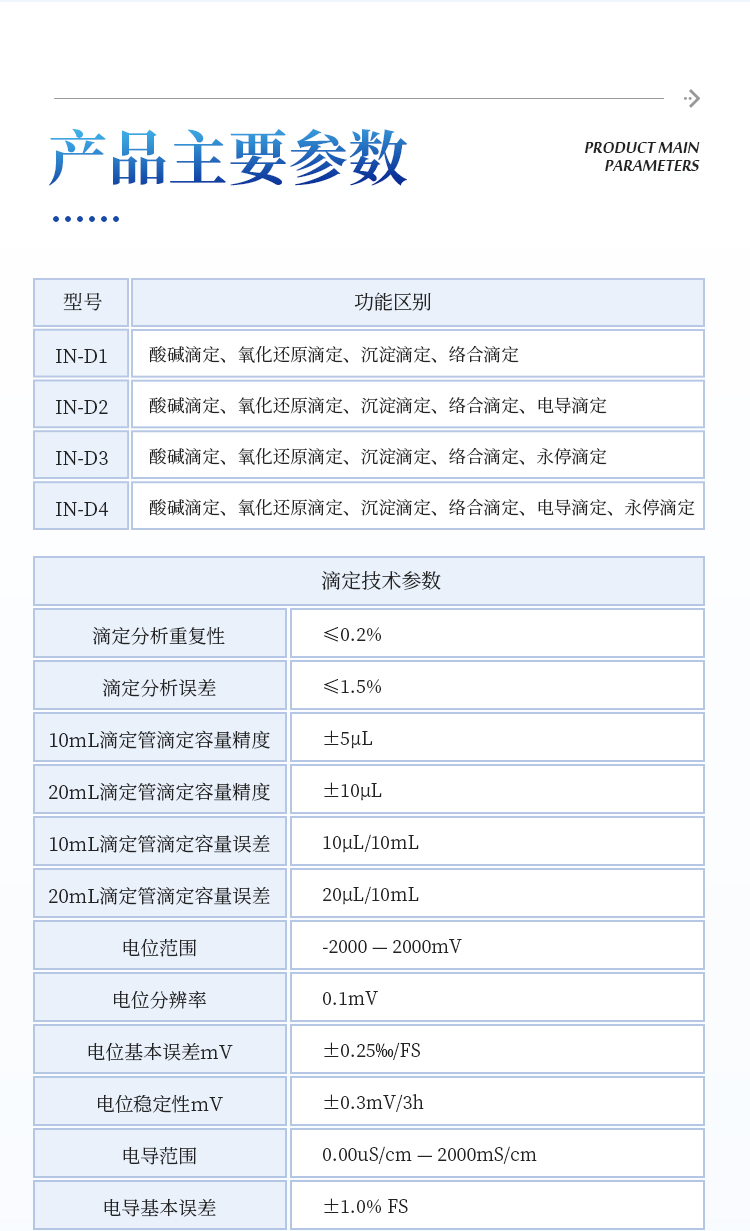简要描述: 电位滴定仪是一种用于化学分析的精密仪器,他通过自动添加滴定剂来确定样品中特定成分的浓度。该仪器基于电位滴定原理工作,即根据在滴定过程中电池电动势的变化来确定滴定终点的一款滴定设备。设备满足国家检定规程JJG 814-2015《自动电位滴定仪》仪器级别中的0.05级别,即仪器最大示值误差为±1.5%,仪器示值重复性≤0.2%.