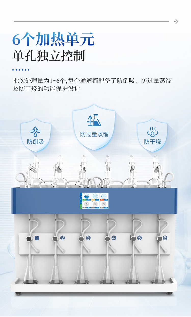 1、批次处理量为1——6个,每个通道均独立控制,并且每个通道都配备了防倒吸、防过量蒸馏及防干烧的功能保护设计;