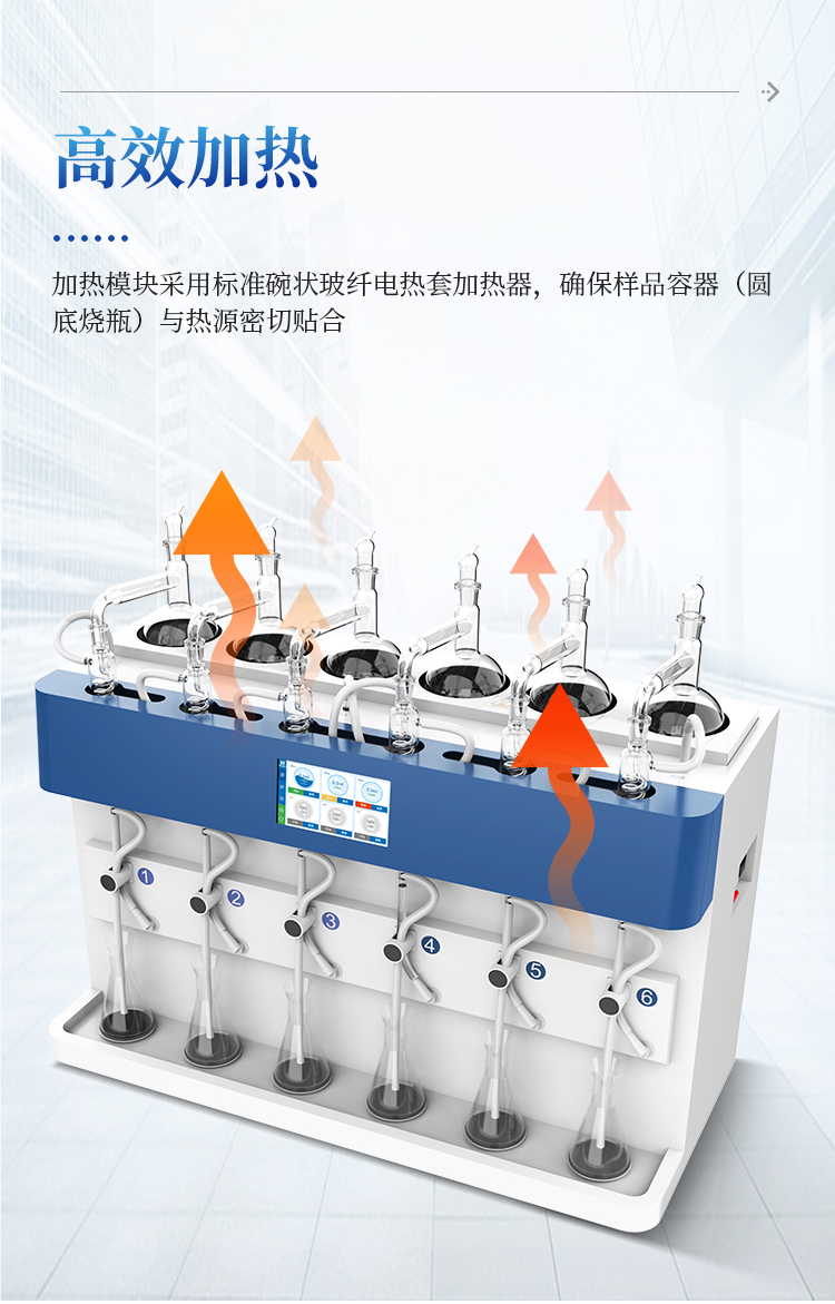 3、加热模块采用标准碗状玻纤电热套加热器,确保样品容器(圆底烧瓶)与热源密切贴合,加热功率调节范围广、加热均匀性好、热辐射效率高,蒸馏速度快、使用寿命长。
