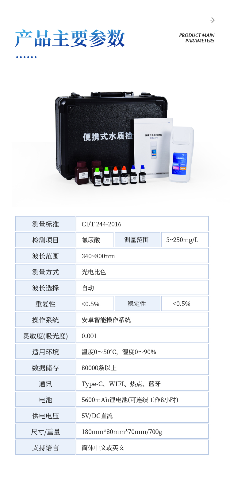 简要描述: 氰尿酸检测仪FK-QNS是一款适用于游泳场馆、户内外游泳池、水上乐园、温泉浴池、等领域的检测仪,配合快速显色检测试剂,可“快速、简单、准确、稳定”进行测量,拥有精美的外观造型,简单的操作界面,准确的检测系统,帮助用户获得精细的数据,可更准确、有效的分析水体状况,提前预防养殖风险,及时避免损失。