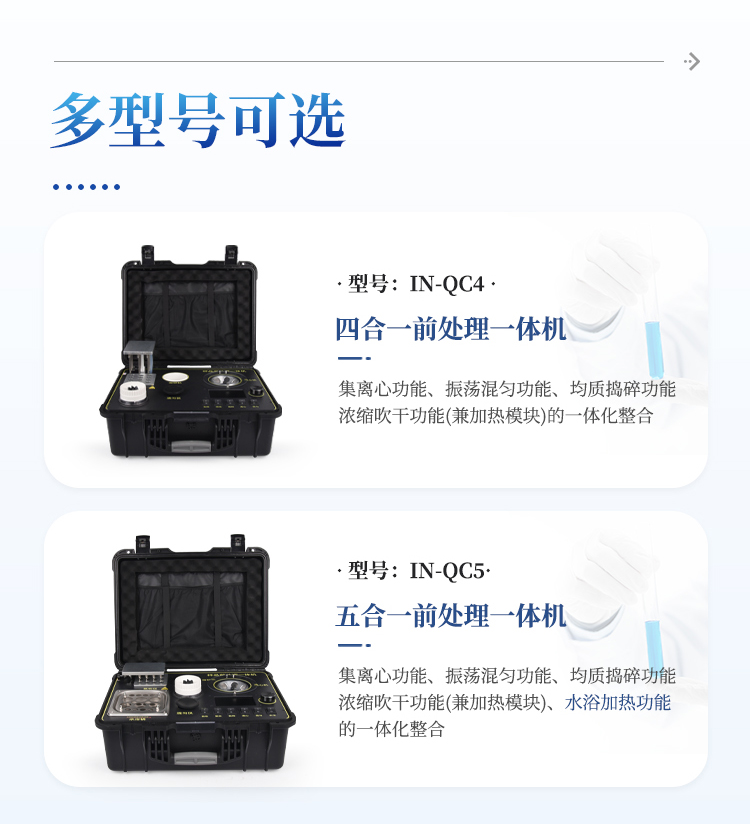 QC4型四合一样品检测前处理一体机(箱)是集吹干、离心、均质、混匀功能的一体化整合,极大的简化和集中样品前处理的一般操作过程,结合移动便携的工程塑料箱体,特别适合农兽药残留畜禽水产品质量安全现场快速检测。