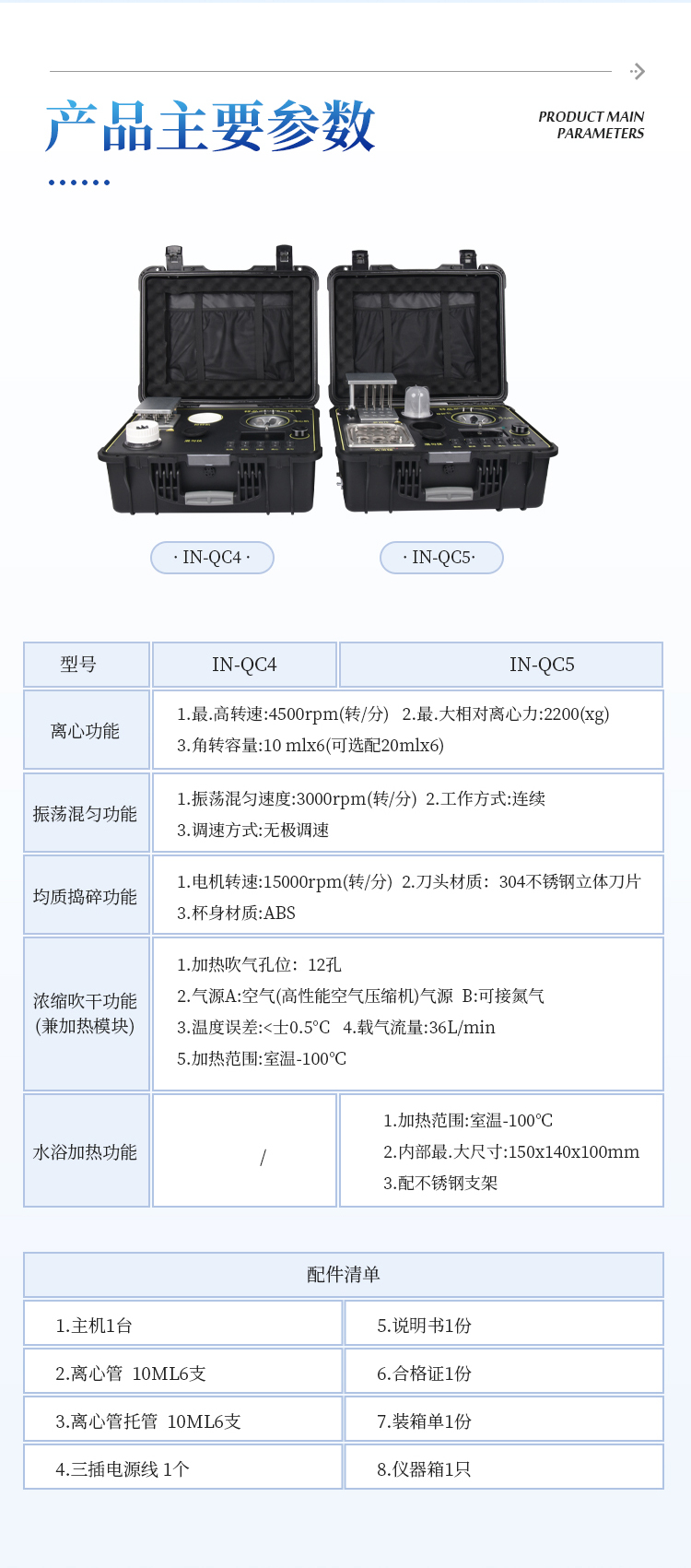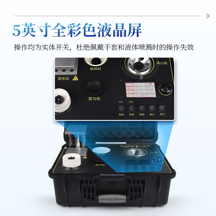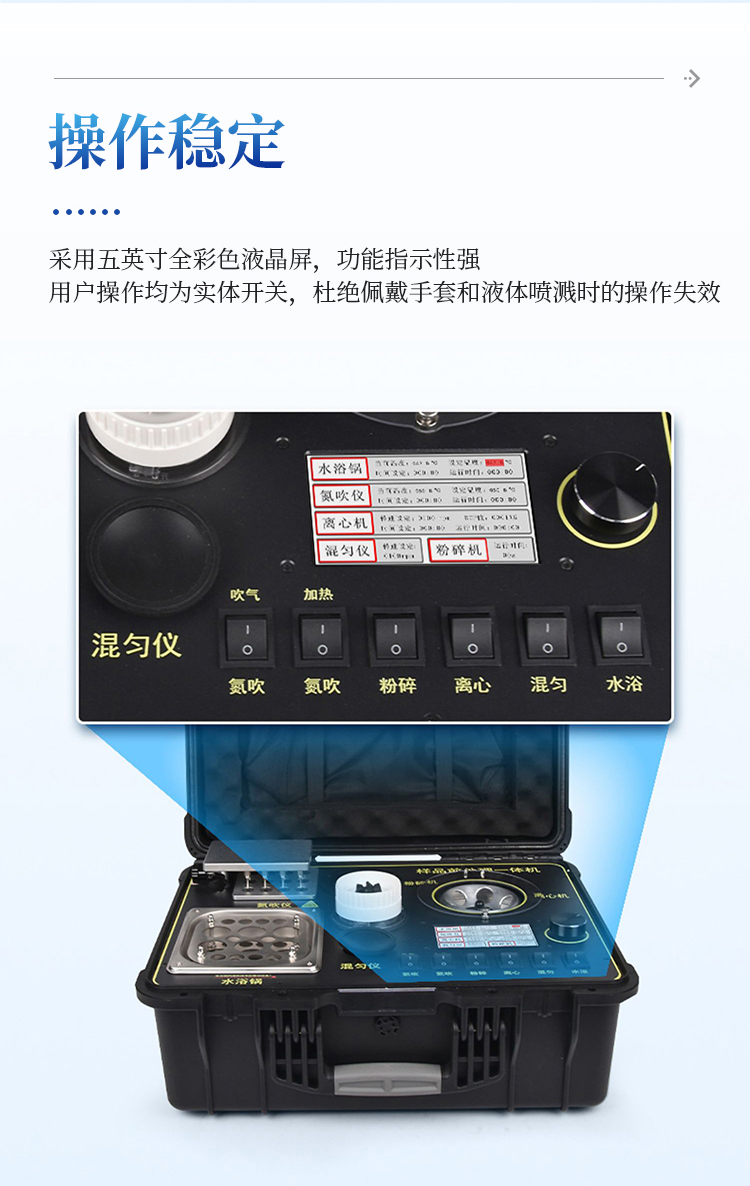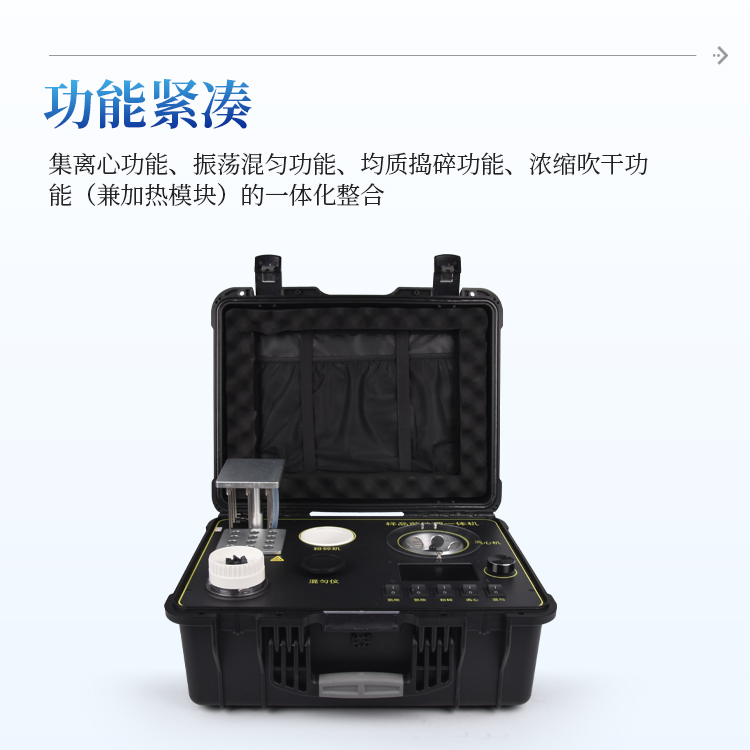 简要描述: QC4型四合一样品检测前处理一体机(箱)是集吹干、离心、均质、混匀功能的一体化整合,极大的简化和集中样品前处理的一般操作过程,结合移动便携的工程塑料箱体,特别适合农兽药残留畜禽水产品质量安全现场快速检测。