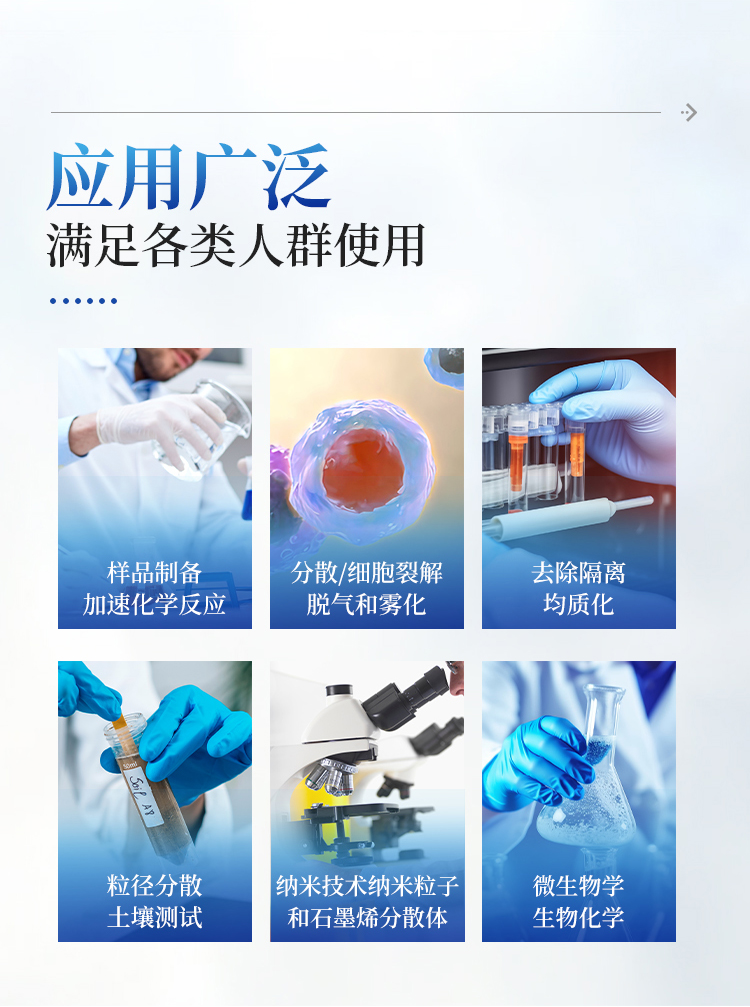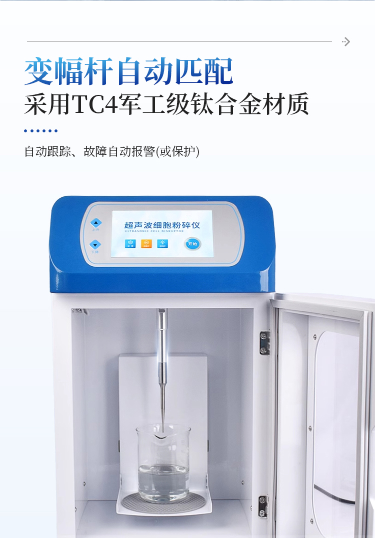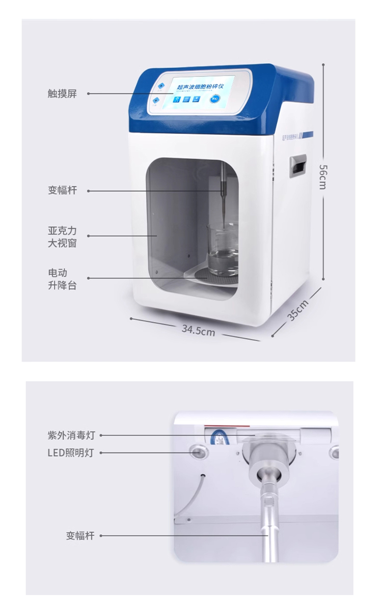 超声波细胞粉碎仪(一体式)将隔音箱融入到主机中形成一体化。功能齐全、外观新颖、性能可靠。仪器采用大屏液晶显示;中央微机集中控制,超声输出、间隙时间、超声功率、温度可任意设定,样品温度监测显示,频率自动跟踪,故障自动报警等功能。