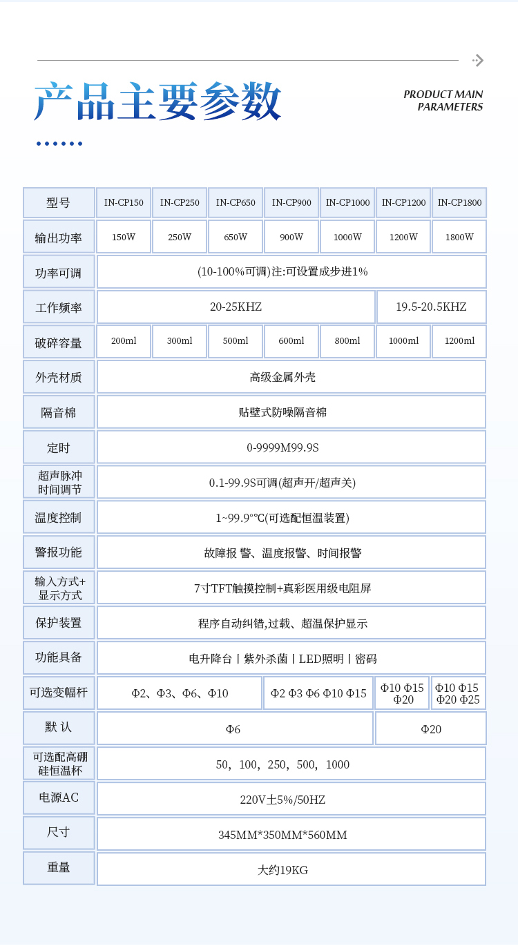 简要描述: 超声波细胞粉碎仪将隔音箱融入到主机中形成一体化。功能齐全、外观新颖、性能可靠。仪器采用大屏液晶显示;中央微机集中控制,超声输出、间隙时间、超声功率、温度可任意设定,样品温度监测显示,频率自动跟踪,故障自动报警等功能。