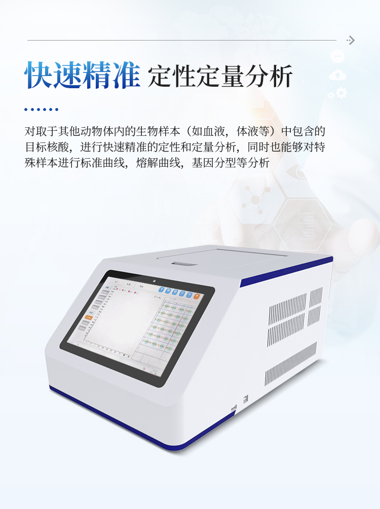 对取于其他动物体内的生物样本(如血液,体液等)中包含的目标核酸,进行快速精准的定性和定量分析,同时也能够对特殊样本进行标准曲线,熔解曲线,基因分型等分析。