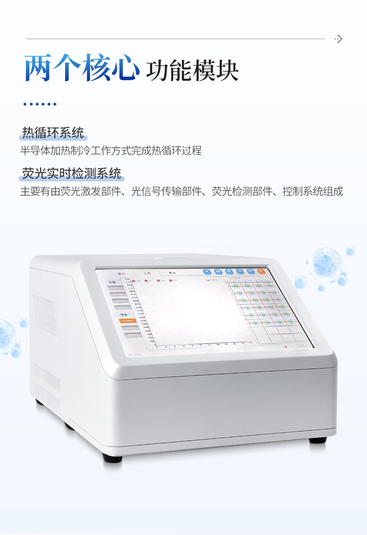 实时荧光定量PCR系统是实时检测反应的仪器,主要由基因扩增热循环系统、荧光实时检测系统、微电路控制系统、计算机及应用软件组成。其中两个核心功能模块:热循环系统和荧光实时检测系统。其中基因扩增热循环系统工作原理与传统基因扩增仪工作原理基本相同,采用半导体加热制冷工作方式完成热循环过程。荧光检测系统主要有由荧光激发部件、光信号传输部件、荧光检测部件、控制系统组成。