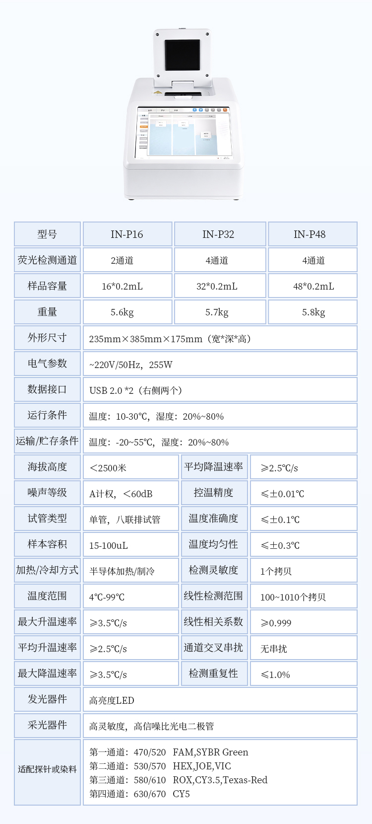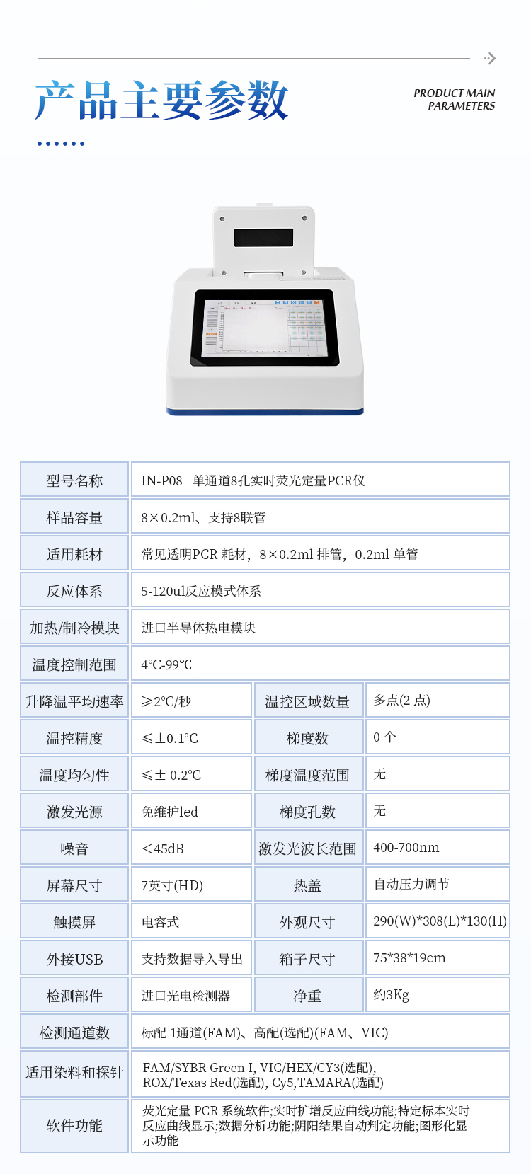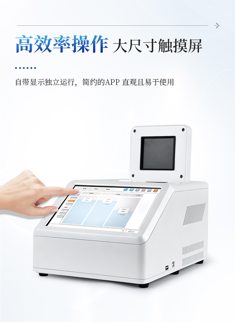 简要描述: 8孔PCR仪主要用于运行实时荧光定量PCR实验,通过荧光激发和采集的方式,对实验过程进行实时监控,将实验过程数据绘制成荧光曲线,实时呈现于仪器显示界面,并对实验数据进行拟合和分析,最后可生成PDF格式的实验报告。