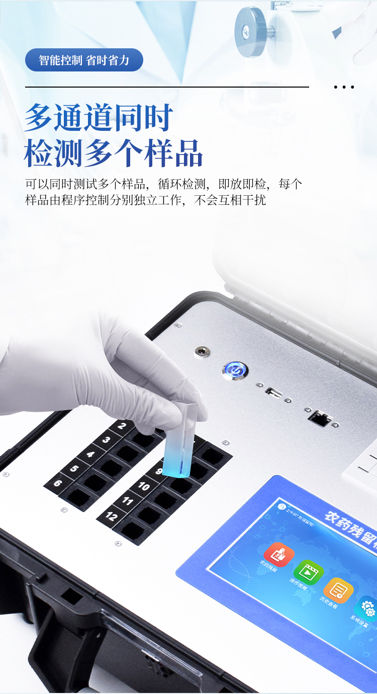 5、检测通道:6个检测通道,可以同时测试多个样品,循环检测,即放即检,每个样品由程序控制分别独立工作,不会互相干扰。