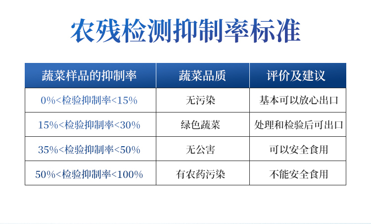 检测标准:依据国家标准方法(GB/T5009.199-2003)以及世界卫生组织WHO、世界粮农组织FAO残留农药检测标准、世界环境保护局EPA参照摄入量等要求来设计。采用酶抑制率比色法对水果、蔬菜等农林产品中有机磷和氨基甲酸酯类农药含量进行快速准确的检测,乙酰胆碱酯酶和丁酰胆碱酯酶试剂均可以使用,符合国家标准和农业部标准的要求。