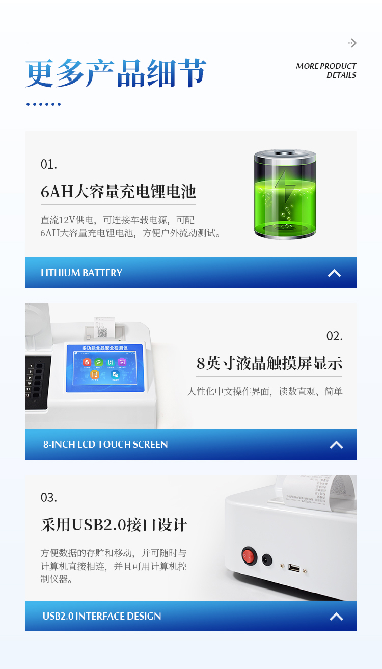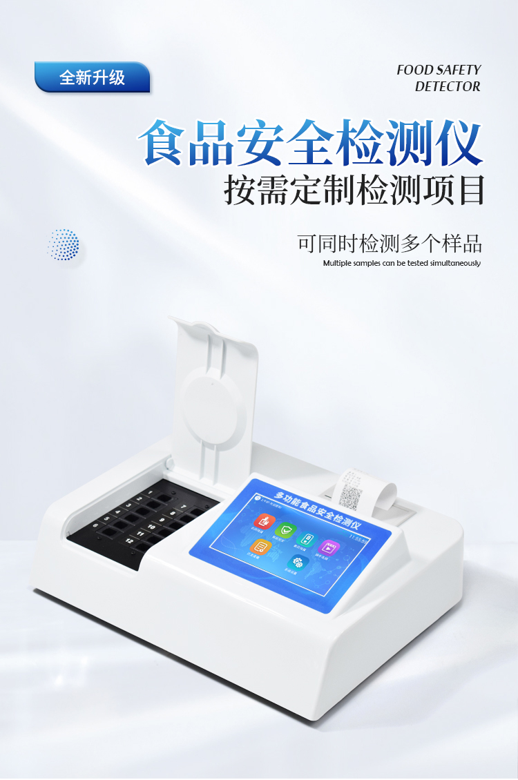 该多功能食品安全检测仪为集成化食品安全快速检测分析设备,广泛应用于食药监局、卫生部门、高教院校、科研院所、农业部门、养殖场、屠宰场、食品肉产品深加工企业、检验检疫部门等单位使用。
