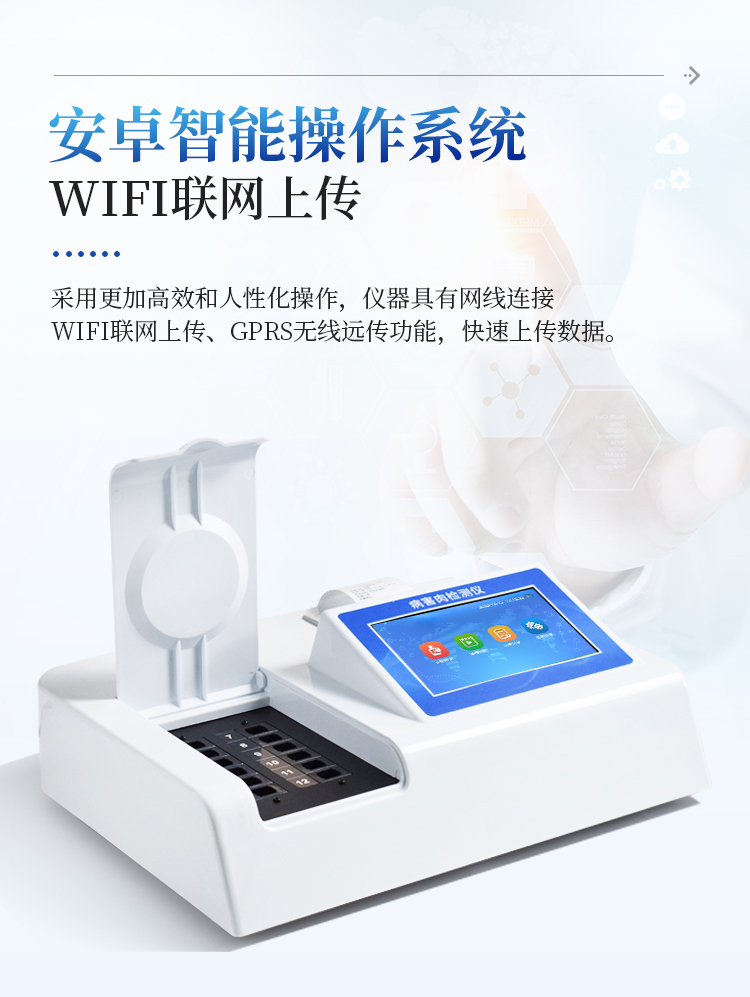 1、安卓智能操作系统,采用更加高效和人性化操作,仪器具有网线连接、wifi联网上传、GPRS无线远传功能,快速上传数据。