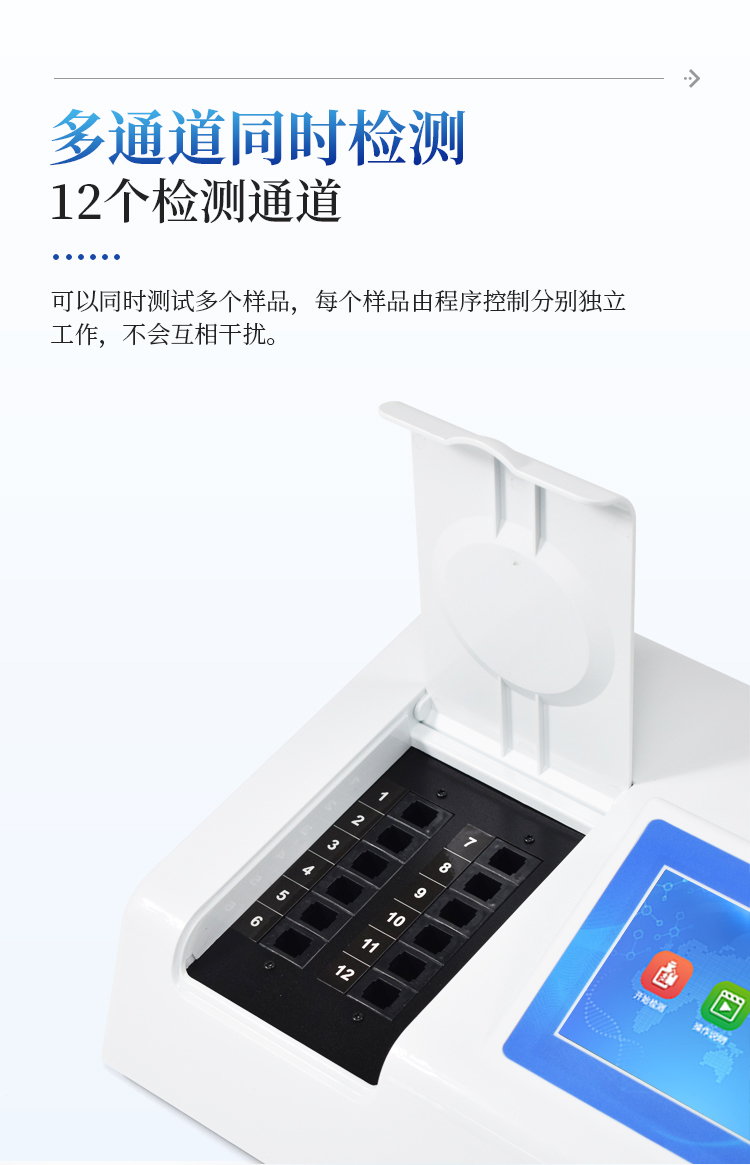 3、检测通道:≥12个检测通道,可以同时测试多个样品,每个样品由程序控制分别独立工作,不会互相干扰。