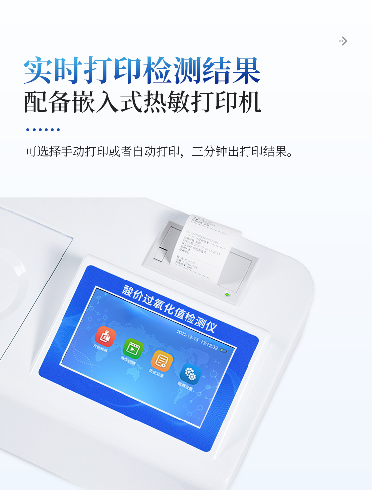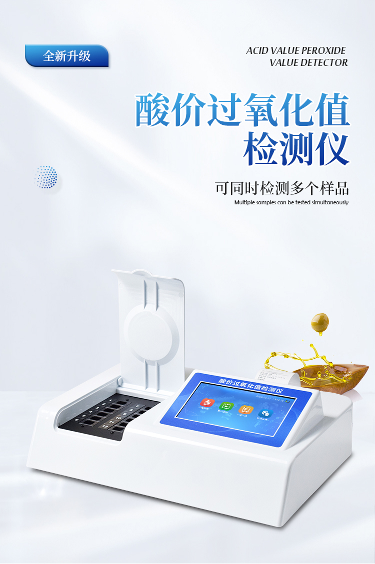 食用油酸价过氧化值检测仪为集成化油品快速检测分析设备,能够快速检测食用植物油、食用猪油、花生油、葵花油、米糠油、食品、肉制品中的酸价、过氧化值含量;通过检测可确定植物油是否符合国家标准或是否为酸败油、劣质油、地沟油等。仪器预留其他项目检测程序和端口,根据日后需求可方便的自主增加检测项目。日后可升级为检测水产品、面制品的综合类型仪器。