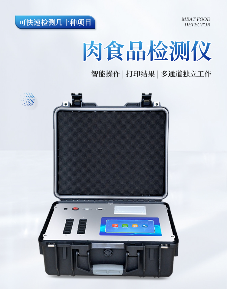 多功能肉制品安全检测仪可快速检测几十种项目,包含各种兽药残留:抗生素类残留、瘦肉精激素类残留;病害肉诊断:肉类新鲜度、肉中组胺、挥发性盐基氮;水产品安全筛查等现场的定性定量检测。