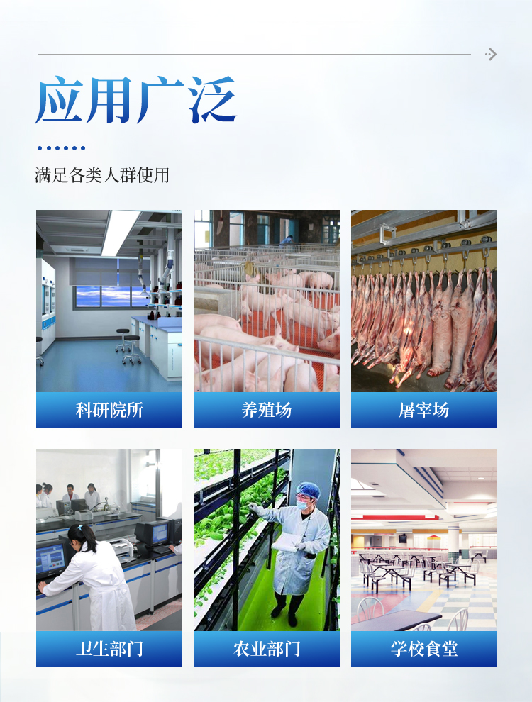 该多功能肉类检测仪为集成化肉品安全快速检测分析设备,广泛应用于养殖场、屠宰场、食品肉产品深加工企业、检验检疫部门、食药监局、卫生部门、高教院校、科研院所、农业部门等单位使用。