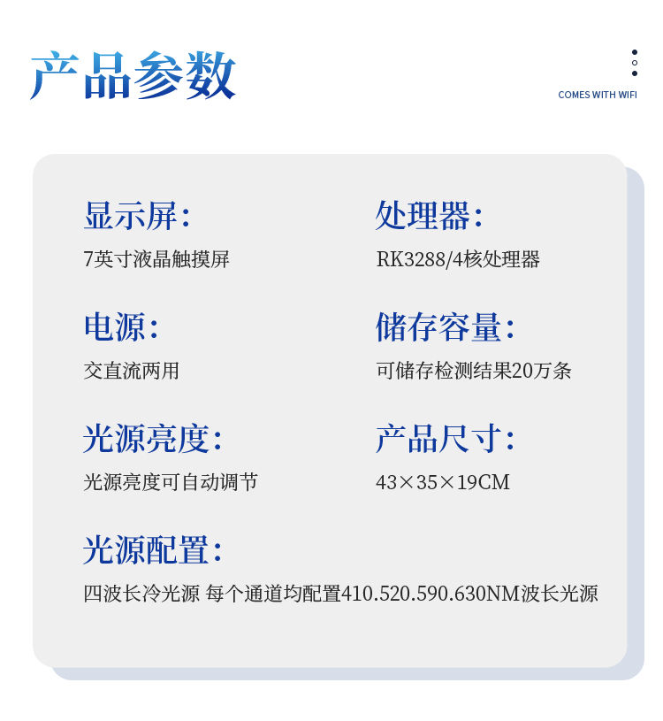 4、四波长冷光源,12个检测通道,每个通道均配置410、520、590、630nm波长光源,标配先进的光路切换装置,专业光路切换功能可实现最多64波长,并且所有检测项目可实现所有通道同时检测。